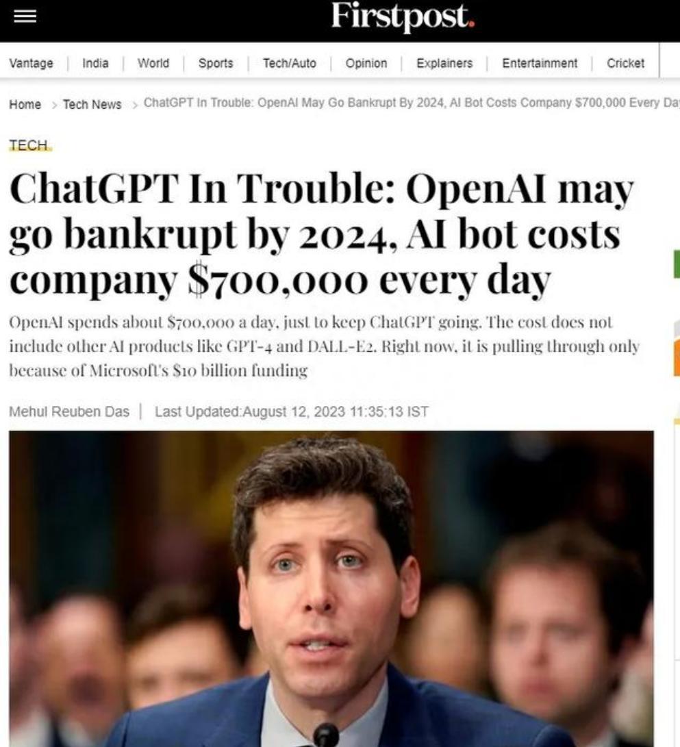 2023 年 1 月,投資銀行摩根士丹利的一份分析報(bào)告稱,在 ChatGPT 上回復(fù)的成本約為谷歌搜索查詢平均成本的 6 倍至 28 倍。根據(jù)摩根士丹利最近的分析,谷歌去年 3.3 萬(wàn)億次搜索的平均成本約為每次 0.2 美分。因此可以看出,ChatGPT 聊天回復(fù)成本為 1.2 美分至 5.6 美分之間。根據(jù)公開(kāi)的信息顯示,GPT4 一次完整的訓(xùn)練大約需要 6000 多萬(wàn)美元,報(bào)道所說(shuō)的 ChatGPT 每天耗費(fèi) 70 萬(wàn)美元,應(yīng)該主要是數(shù)據(jù)中心的日常算力消耗。僅在 2022 年 OpenAI 的財(cái)務(wù)凈虧損就高達(dá) 5.45 億美元。甚至有印度媒體聲稱 OpenAI 有在 2024 年倒閉的可能。