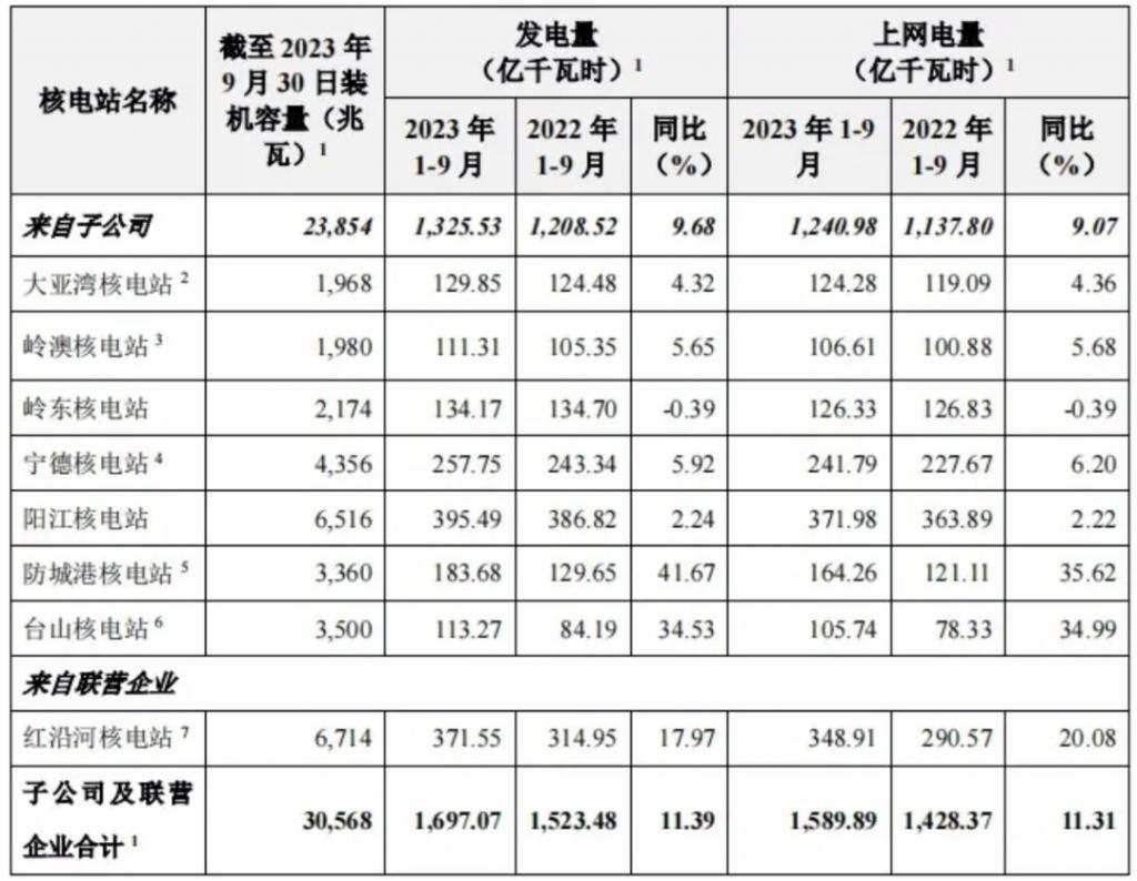 中國(guó)廣核是目前國(guó)內(nèi)最大的核電公司,目前尚未發(fā)布 2023 年年報(bào),以 2023 年三季報(bào)數(shù)據(jù)來(lái)看,截至 2023 年 9 月 30 日,中國(guó)廣核總發(fā)電量為 1697.07 億千瓦時(shí),平均到每季度,算上其 11.39% 左右的增幅,2023 年全年發(fā)電量最高不超過(guò) 2300 億千瓦時(shí)。