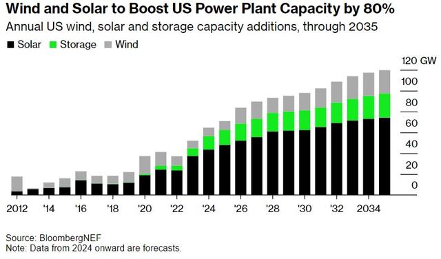 根據(jù)BloombergNEF預(yù)測數(shù)據(jù),預(yù)計到2035年,美國總發(fā)電量將增加80%,主要得益于近1太瓦的新增太陽能和風(fēng)能。