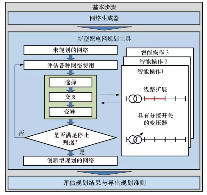 文獻(xiàn)[18]針對(duì)中、低壓配網(wǎng)提出一種基于遺傳算法(geneticalgorithm,GA)的規(guī)劃方法,如圖6所示。第一步,根據(jù)不同的供用電要求以及實(shí)際電網(wǎng)特征,生成特征各異的網(wǎng)絡(luò)結(jié)構(gòu);第二步,利用GA方法針對(duì)每種網(wǎng)絡(luò)結(jié)構(gòu)得到最優(yōu)的傳統(tǒng)建設(shè)方案和智能建設(shè)方案;最后,對(duì)所得方案進(jìn)行評(píng)估比較。運(yùn)用GA算法時(shí),每種符合運(yùn)行約束要求的電網(wǎng)配置方案都作為一個(gè)個(gè)體,每次迭代時(shí),以各種網(wǎng)絡(luò)成本(適應(yīng)度函數(shù))最小為目標(biāo),先隨機(jī)挑選兩個(gè)個(gè)體進(jìn)行交叉生成新個(gè)體,然后以減小成本為原則修改個(gè)體(變異),變異后計(jì)算潮流以驗(yàn)證網(wǎng)絡(luò)約束是否越限,如果越限,則通過(guò)擴(kuò)建線路等措施修改個(gè)體,或回退到變異之前的初始狀態(tài);此過(guò)程不斷繼續(xù),直到滿足收斂判據(jù)。另外,該方法還采用了所謂智能操作(smartoperator)來(lái)改善GA求解效率不高的缺陷,即利用一些有效措施(如中低壓變壓器分接頭切換和線路擴(kuò)建相結(jié)合)對(duì)當(dāng)前結(jié)果進(jìn)行智能化修正,加速找到最優(yōu)解的過(guò)程。