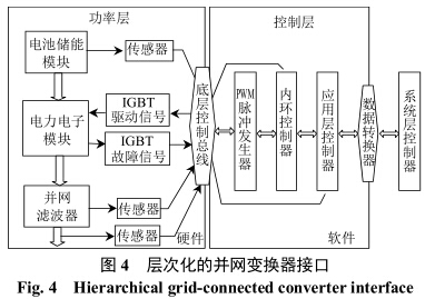 參照通信系統(tǒng)的開放系統(tǒng)互連(open system in-terconnection,OSI)模型,并網(wǎng)變換器分層控制功能示意圖如圖3所示。圖3中:θ為電網(wǎng)電壓相位;SPLL(software phase loop)為軟鎖相環(huán)[11];IGBT(insulated gate bipolar transistor)為絕緣柵雙極型晶體管。硬件層控制模塊由FPGA完成;應用層控制模塊由DSP完成算法運算,提高了系統(tǒng)靈活性;系統(tǒng)層控制由上位機完成,可以實現(xiàn)多個儲能系統(tǒng)的大規(guī)模調(diào)度。層次化的并網(wǎng)變換器接口如圖4所示。