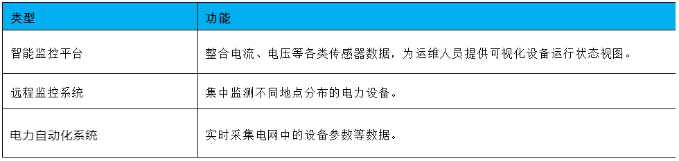 包括各類智能監(jiān)控平臺(tái)、遠(yuǎn)程監(jiān)控系統(tǒng)、電力自動(dòng)化系統(tǒng)等收集的設(shè)備運(yùn)行狀態(tài)和電網(wǎng)運(yùn)行信息。其功能見表4。
