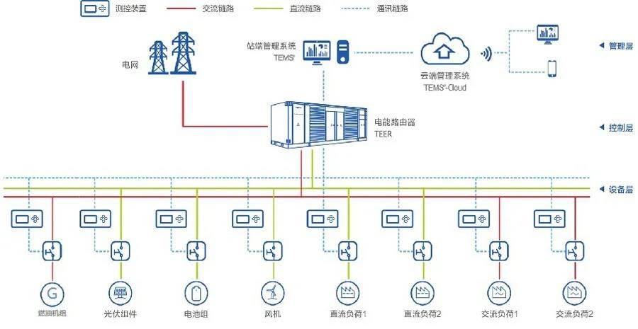 基于電力電子變壓器的交直流混合微網(wǎng)系統(tǒng)總體可分為三層架構(gòu)。第一層為設(shè)備層,主要囊括了分布式電源(風(fēng)電、光伏系統(tǒng)等)和不同的交直流負(fù)荷;第二層控制層,以電力電子變壓器為核心,分布式電源和負(fù)荷可通過(guò)其靈活的多端口配置實(shí)現(xiàn)可靠接入,并通過(guò)其中/高壓接口,實(shí)現(xiàn)與配電網(wǎng)的有效連接;第三層為管理層,以“雙端”能量管理系統(tǒng)為核心,采用人工智能算法可實(shí)現(xiàn)電力電子變壓器交直流混合系統(tǒng)的分布式能源互補(bǔ)優(yōu)化以及多個(gè)端口之間的協(xié)調(diào)控制,提高能源利用效率,多機(jī)并聯(lián)系統(tǒng)的集群控制、功率在線優(yōu)化分配,保障系統(tǒng)效率最優(yōu),同時(shí)能夠?qū)与娋W(wǎng)調(diào)度,參與電力市場(chǎng)交易及輔助服務(wù)等,真正實(shí)現(xiàn)綠色數(shù)據(jù)中心電能的智能路由。