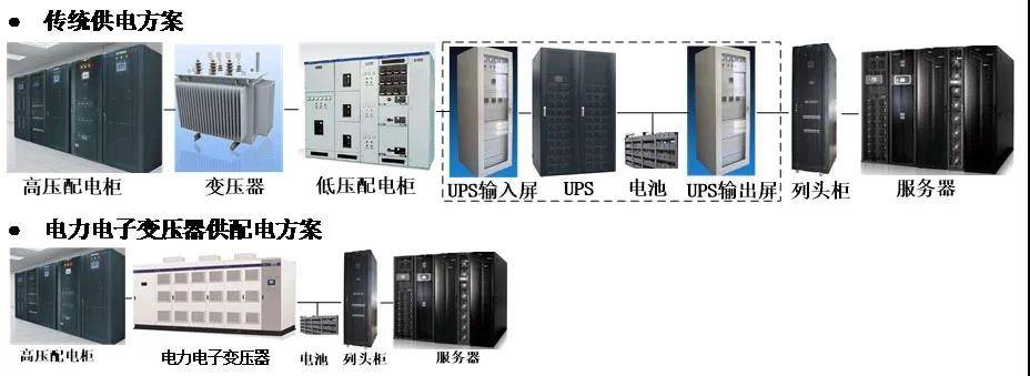 數(shù)據(jù)中心傳統(tǒng)的UPS供電方案,是由高壓配電柜、變壓器、低壓配電柜、UPS等組成,雖然系統(tǒng)方案成熟,但由于設(shè)備種類(lèi)數(shù)量多,電能變換環(huán)節(jié)多,占地面積大,轉(zhuǎn)換效率低,已有被逐步淘汰的趨勢(shì)。