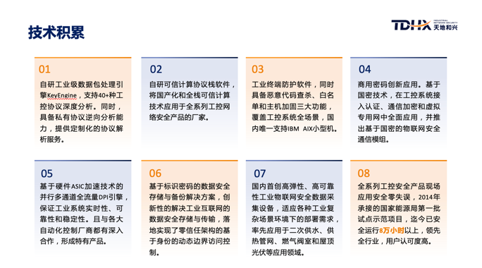 本次活動中,副總裁楊小帥更近一步向大家介紹了天地和興深厚的技術積累:自研工業(yè)級數(shù)據(jù)包處理引擎KeyEngine,支持40+種工控協(xié)議深度分析;自研可信計算協(xié)議棧軟件,是將國產(chǎn)化和全棧可信計算技術應用于全系列工控網(wǎng)絡安全產(chǎn)品的廠商;工業(yè)終端防護軟件,覆蓋工控系統(tǒng)全場景,還是國內(nèi)唯一支持IBM AIX小型機;商用密碼創(chuàng)新應用,并推出基于國密的物聯(lián)網(wǎng)安全通信模組;基于硬件ASIC加速技術的并行多通道全流量DPI引擎,保證工業(yè)系統(tǒng)實時性、可靠性和穩(wěn)定性;基于標識密碼的數(shù)據(jù)安全存儲與備份解決方案,創(chuàng)新性的解決工業(yè)互聯(lián)網(wǎng)的數(shù)據(jù)安全存儲與傳輸;國內(nèi)首創(chuàng)高彈性、高可靠性工業(yè)物聯(lián)網(wǎng)安全數(shù)據(jù)采集設備,適應各種工業(yè)復雜場景環(huán)境下的部署需求;全系列工控安全產(chǎn)品現(xiàn)場應用安全零失誤,2014年承接的國家能源局第一批試點示范項目,迄今已安全運行8萬小時以上。