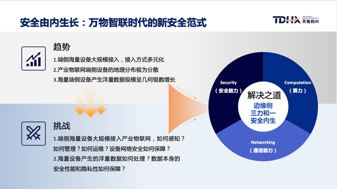 工業(yè)和信息化部研究機構數(shù)據(jù)顯示:我國工業(yè)互聯(lián)網(wǎng)產(chǎn)業(yè)規(guī)模目前已邁過了“萬億”大關,并進一步刺激了數(shù)字經(jīng)濟在工業(yè)領域的廣泛應用,工業(yè)制造的數(shù)字化和網(wǎng)絡化催生出巨大的網(wǎng)絡安全需求。天地和興CTO李凱斌介紹:數(shù)字經(jīng)濟大背景下,萬物智聯(lián)時代將面臨新安全挑戰(zhàn),即:1、端側(cè)海量設備大規(guī)模接入產(chǎn)業(yè)物聯(lián)網(wǎng),如何感知?如何管理?如何運維?設備網(wǎng)絡安全如何保障?2、海量設備產(chǎn)生的洋量數(shù)據(jù)如何處理?數(shù)據(jù)本身的安全性能和隱私性如何保障?而解決之道在于“三力合一”:安全能力、算力、通信能力,三者合一。安全,由內(nèi)生長。