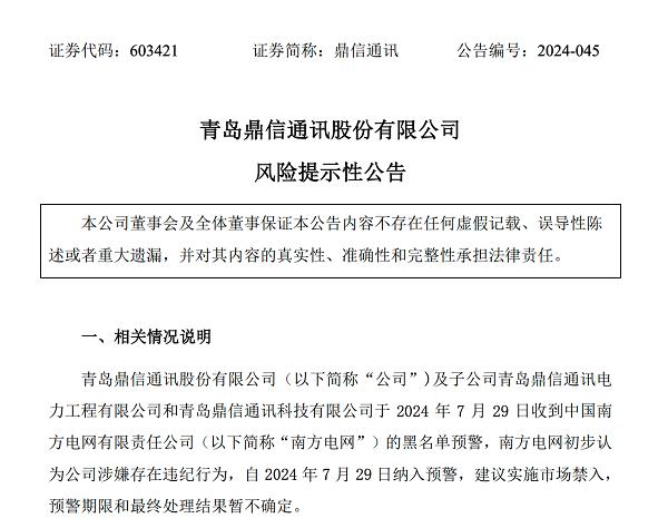 7月30日,鼎信通訊(603421.SH)提示風(fēng)險(xiǎn),公司及子公司于7月29日收到中國(guó)南方電網(wǎng)有限責(zé)任公司(以下簡(jiǎn)稱(chēng)“南方電網(wǎng)”)的黑名單預(yù)警,南方電網(wǎng)初步認(rèn)為公司涉嫌存在違紀(jì)行為,自2024年7月29日納入預(yù)警,建議實(shí)施市場(chǎng)禁入,預(yù)警期限和最終處理結(jié)果暫不確定。