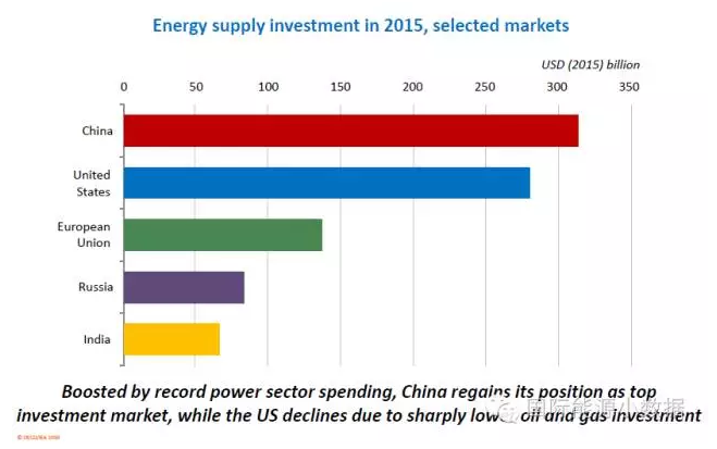 2015年中國能源領(lǐng)域總投資為3150億美元,占全球能源總投資的17%,是世界上第一能源投資大國,遠(yuǎn)超位居第二的美國(2800億美元)。在中國能源投資中,有900億美元用于可再生能源發(fā)電;450億美元用于化石能源電廠(主要是煤電廠,2015年新增煤電裝機(jī)接近45吉瓦)。