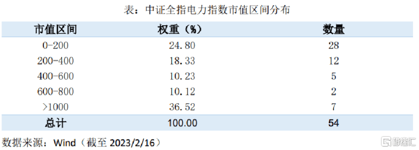 從市值分布來(lái)看,中證全指電力指數(shù)呈現(xiàn)較為明顯的中小盤特征,其中市值規(guī)模在400億之下的成份股權(quán)重合計(jì)占比為43%,數(shù)量達(dá)到40只。