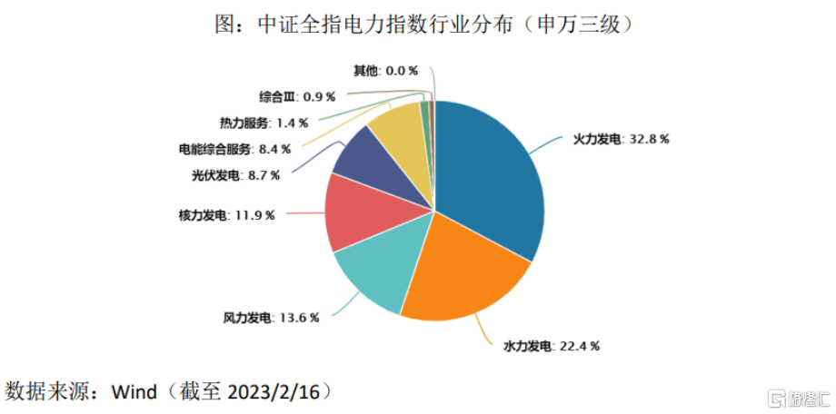 就細(xì)分行業(yè)分布來(lái)看,該指數(shù)成分股集中于電力行業(yè),重點(diǎn)關(guān)注火電、水電、新能源發(fā)電,并共同捕捉傳統(tǒng)發(fā)電和新能源發(fā)電領(lǐng)域的投資機(jī)會(huì)。其中,以權(quán)重最大的成分股長(zhǎng)江電力(600900.SH)為例,火電占比達(dá)32.8%,水電占22%,風(fēng)電占13%,光伏占比不到10%。