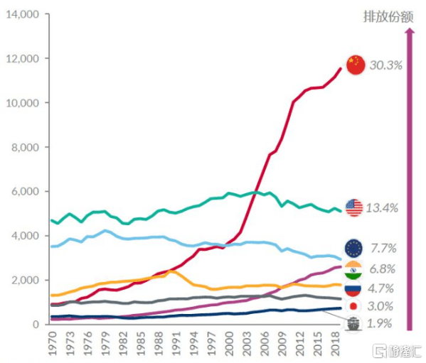 尤其是,中國(guó)、美國(guó)、歐盟等碳排放大國(guó)近幾年加快推進(jìn)“碳中和”實(shí)現(xiàn)進(jìn)程。根據(jù)公開(kāi)數(shù)據(jù)顯示,2021年中國(guó)碳排放量占全球碳排放總量30.3%,美國(guó)占13.4%,歐盟占7.7%。