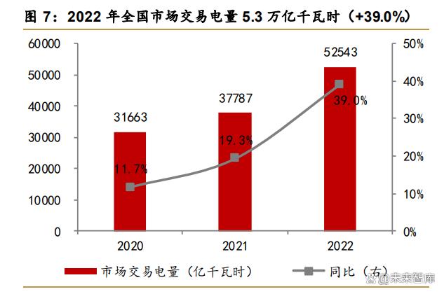 全國(guó)市場(chǎng)化交易電量占全社會(huì)用電量的比重逐年上升。新一輪電改實(shí)施以來(lái),我國(guó)電力 市場(chǎng)建設(shè)穩(wěn)步有序推進(jìn),價(jià)格機(jī)制也愈加完善,市場(chǎng)化交易電量占全社會(huì)用電量的比重大幅 提升。2022 年全國(guó)市場(chǎng)交易電量約 5.3 萬(wàn)億千瓦時(shí),同比高增 39.0%,占全社會(huì)用電量比 重為 60.8%,較 2021 年提升 15.3pp。據(jù)中電聯(lián)《中國(guó)電力行業(yè)年度發(fā)展報(bào)告 2022》顯示, 截至 2021 年底,全國(guó)各電力交易中心累計(jì)注冊(cè)市場(chǎng)主體 46.7 萬(wàn)家,數(shù)量較 2020 年增長(zhǎng) 76.0%。電力市場(chǎng)化建設(shè)具備先進(jìn)性,一方面,市場(chǎng)化價(jià)格有利于充分反映電力市場(chǎng)真實(shí)供 需變化,煤價(jià)上漲等成本壓力通過更高電價(jià)傳導(dǎo)到下游的機(jī)制更順暢;另一方面,電力市場(chǎng) 化交易有利于實(shí)現(xiàn)電力資源在全國(guó)范圍內(nèi)的優(yōu)化配置,更好實(shí)現(xiàn)跨省跨區(qū)電力傳送。