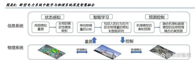 智慧融合是構(gòu)建新型電力系統(tǒng)的基礎(chǔ)。新型電力系統(tǒng)以數(shù)據(jù)為核心驅(qū)動,呈現(xiàn)數(shù)字與物理 系統(tǒng)深度融合特點(diǎn),系統(tǒng)控制運(yùn)行由“量測-控制”模式向多物理系統(tǒng)的狀態(tài)感知、智能 學(xué)習(xí)和預(yù)測控制等方式轉(zhuǎn)變。1)狀態(tài)感知:電網(wǎng)內(nèi)外參與耦合運(yùn)行的物理系統(tǒng),將從局 部的感知量測,向全局的確定性精準(zhǔn)映射轉(zhuǎn)變。2)智能學(xué)習(xí):由于參與要素的多樣性,將 從單純物理量的分析,向包括人的行為在內(nèi)的非物理量的感知和智能研判進(jìn)行轉(zhuǎn)變。3) 預(yù)測控制:將從電力物理系統(tǒng)的機(jī)理模型仿真和預(yù)測,向融合機(jī)理和數(shù)據(jù)模型的信息物理 耦合仿真預(yù)測轉(zhuǎn)變,提升隨機(jī)變量的預(yù)測精度,并應(yīng)用于電網(wǎng)逐級調(diào)控和控制引導(dǎo)。