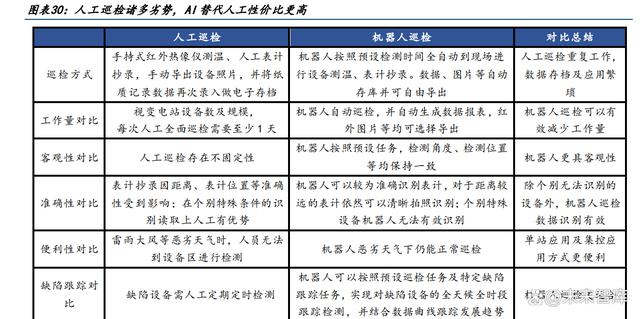 人工巡檢諸多劣勢,AI 替代是大勢所趨。電力行業(yè)有大量巡檢工作條件惡劣,傳統(tǒng)人工 巡檢的工作難度大、危險(xiǎn)指數(shù)高、及時(shí)性低、工作量大;采用智能巡檢,既具有人工巡檢 的靈活性和智能性,同時(shí)響應(yīng)更加及時(shí)、效率更高、成本更低,隨著技術(shù)的發(fā)展,智能機(jī) 器人技術(shù)具有廣闊的應(yīng)用前景,未來電氣行業(yè)無人化巡檢將成為行業(yè)常態(tài)。 AI 替代人工性價(jià)比更高。以 500kv 變電站為例,人工巡檢模式下需要 4 個(gè)工人耗費(fèi)一個(gè) 禮拜的工時(shí)才能進(jìn)行一次全面檢查,假設(shè)每位工人年薪約 8 萬,而同樣的工作量,一臺巡 檢機(jī)器人能在更短的時(shí)間內(nèi)完成,其平均成本為 65 萬/臺,計(jì)提折舊后約 16 萬/年,使 用巡檢機(jī)器人比人工巡檢能節(jié)約 16 萬/年。