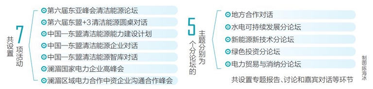本次中國(guó)—東盟清潔能源合作周以“跨越山海 共享未來”為主題,活動(dòng)期間將舉辦第六屆東亞峰會(huì)清潔能源論壇、第六屆東盟+3清潔能源圓桌對(duì)話、中國(guó)—東盟清潔能源能力建設(shè)計(jì)劃、中國(guó)—東盟清潔能源企業(yè)對(duì)話、中國(guó)—東盟清潔能源智庫(kù)對(duì)話、瀾湄國(guó)家電力企業(yè)高峰會(huì)、瀾湄區(qū)域電力合作中資企業(yè)溝通合作峰會(huì)等7項(xiàng)活動(dòng)。5場(chǎng)分論壇的主題分別為“地方合作對(duì)話”“水電可持續(xù)發(fā)展分論壇”“新能源新技術(shù)分論壇”“綠色投資分論壇”“電力貿(mào)易與消納分論壇”,設(shè)置了專題報(bào)告、討論和嘉賓對(duì)話等環(huán)節(jié)。