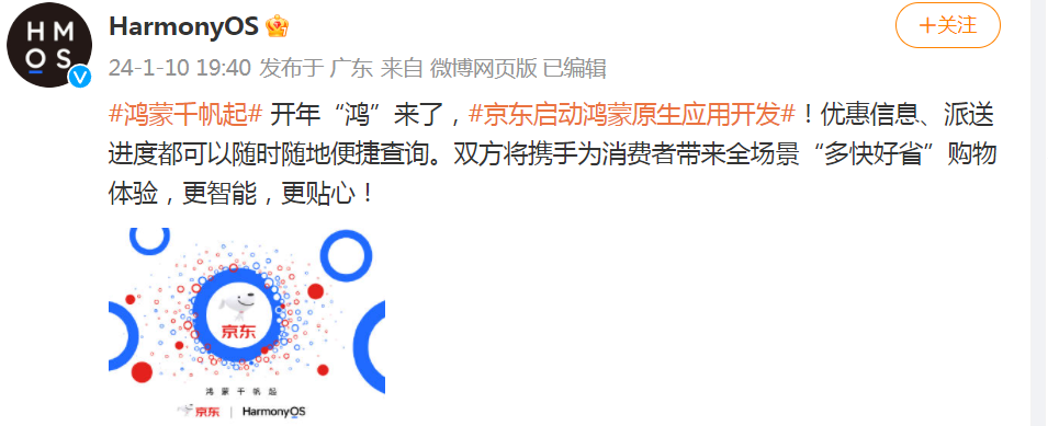1月10日晚,HarmonyOS微博發(fā)文稱:京東啟動鴻蒙原生應用開發(fā),雙方將攜手為消費者帶來全場景“多快好省”購物體驗,更智能,更貼心。