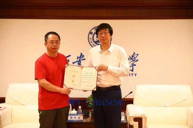 在周鴻祎校友兼職教授授聘儀式上,西安交大校長張立群為周鴻祎頒發(fā)了聘書,并為他佩戴校徽。