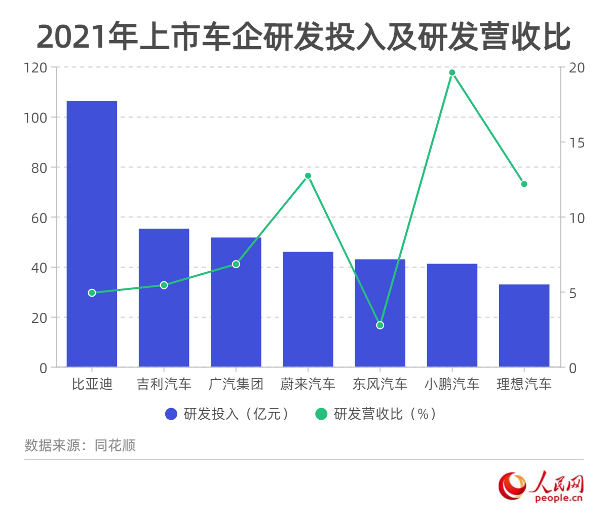 從各家車企的研發(fā)投入來看,A股比亞迪、北汽藍(lán)谷2021年研發(fā)投入同比分別增長24.2%、24.1%,中概股“蔚小理”研發(fā)投入同比分別增長86.4%、138.4%和198.8%。
