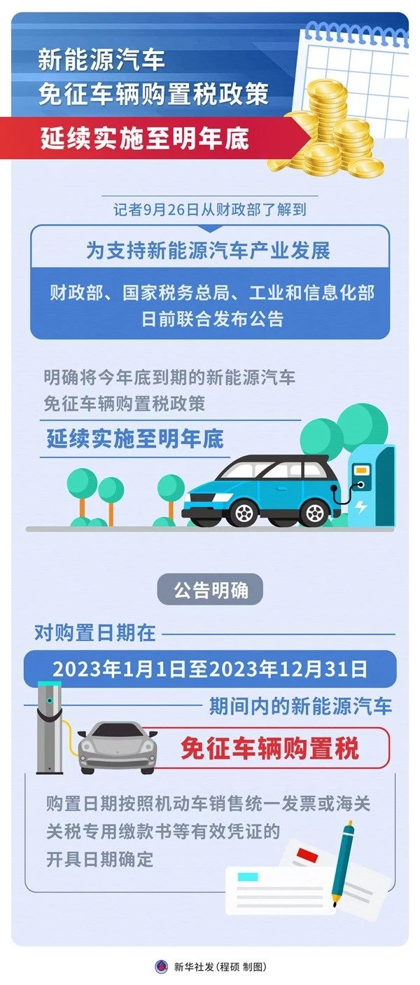 新華社北京9月26日電(記者申鋮)記者26日從財政部了解到,為支持新能源汽車產(chǎn)業(yè)發(fā)展,財政部、國家稅務總局、工業(yè)和信息化部日前聯(lián)合發(fā)布公告,明確將今年底到期的新能源汽車免征車輛購置稅政策,延續(xù)實施至明年底。