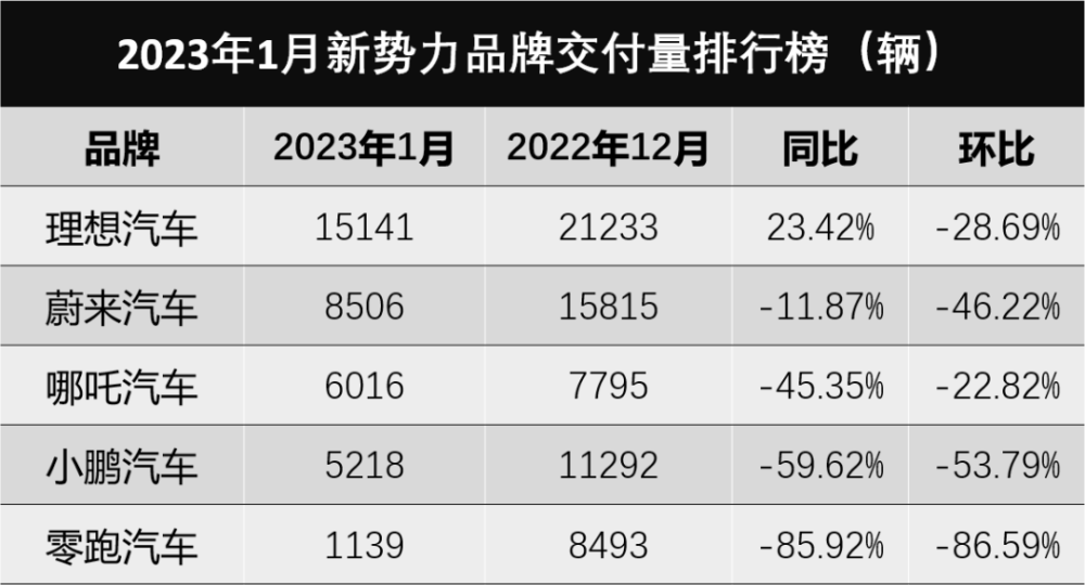 或許是春節(jié)前后家庭用車需求的刺激,理想成為了2023年首月新勢(shì)力車企的大贏家,1月份雖說各家交付量都受長(zhǎng)假影響下跌,但“大家都跌就意味著我沒跌”,尤其是身為新勢(shì)力銷冠的理想汽車,節(jié)后返工說話底氣都更充足了。