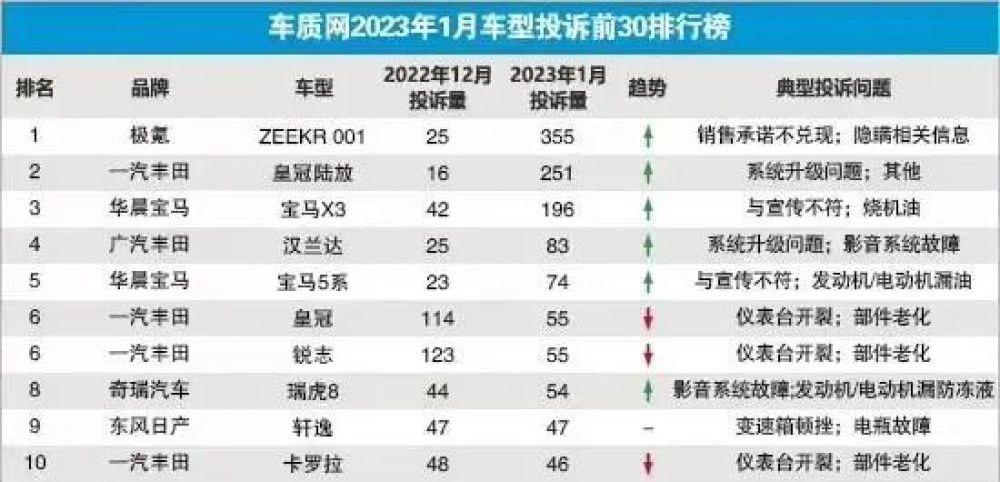 但另一方面,根據(jù)車質(zhì)網(wǎng)公布的2023年1月車型投訴排行榜,極氪001在1月份以355單的投訴量“榮登榜首”,登榜原因主要集中在銷售欺詐、承諾不兌現(xiàn)以及新車座椅鼓包等問題,極氪如果想要在汽車市場(chǎng)上走得更遠(yuǎn),這個(gè)售前售后的問題及時(shí)給消費(fèi)者解決。