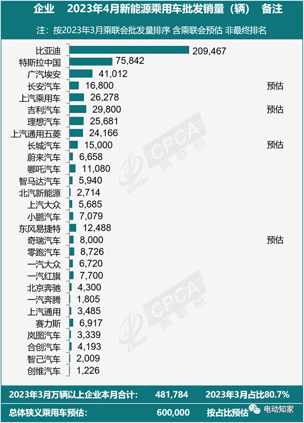 日前,乘聯(lián)會(huì)公布4月新能源乘用車廠商批發(fā)銷量排名,比亞迪以209467臺(tái)位列第一,特斯拉中國以75842臺(tái)位列第二,廣汽埃安以41012臺(tái)位列第三。