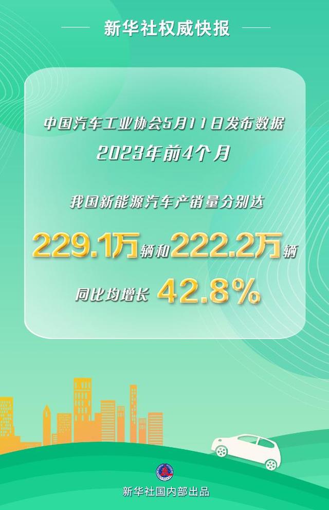 中國汽車工業(yè)協(xié)會(huì)5月11日發(fā)布數(shù)據(jù)顯示,2023年前4個(gè)月我國新能源汽車產(chǎn)銷量分別達(dá)229.1萬輛和222.2萬輛,同比均增長42.8%。