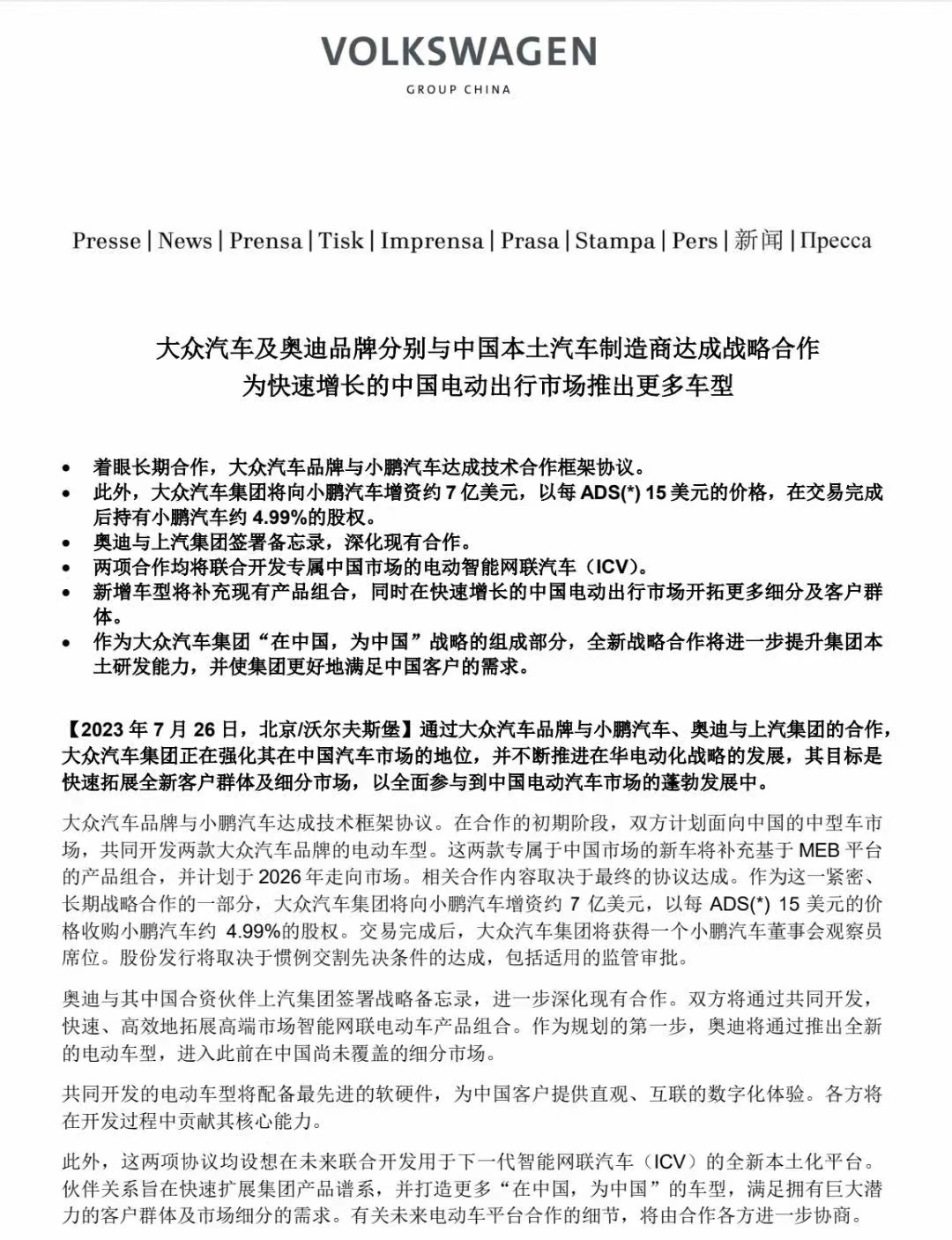 在新車“上市即熱銷”的同時(shí),小鵬還曝出了另一條讓所有人都出乎意料的“大新聞”——7月26日,該品牌與大眾汽車同時(shí)宣布:雙方已達(dá)成技術(shù)框架協(xié)議,將面向中國(guó)的中型車市場(chǎng),共同開(kāi)發(fā)兩款大眾汽車品牌的電動(dòng)車型,并計(jì)劃于2026年推向市場(chǎng)。