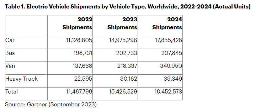 Gartner 表示如果計算汽車、巴士、貨車和重型卡車在內(nèi),所有電動類型的汽車出貨量為 1542 萬輛;明年將達到 1845 萬輛。
