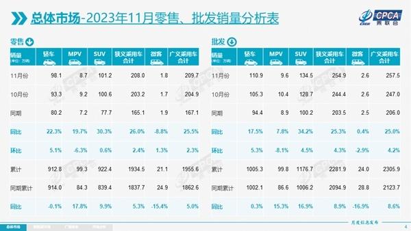 12月8日,乘用車市場信息聯(lián)席會發(fā)布乘用車市場月度數(shù)據(jù)。11月,國內(nèi)狹義乘用車生產(chǎn)、批發(fā)、零售端皆呈現(xiàn)同環(huán)比雙增長的有力表現(xiàn),并連續(xù)第三個月齊齊站上200萬輛關(guān)口。1-11月,狹義乘用車生產(chǎn)、批發(fā)、零售累計增速繼續(xù)擴大,分別達到7.4%、8.9%和5.3%,較1-10月各自提升1.9、1.7和2.1個百分點。