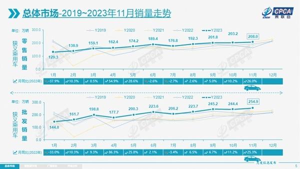 零售方面,11月,狹義乘用車共售出208.0萬輛,同比增長26.0%,環(huán)比增長2.4%;1-11月累計零售量達1934.5萬輛,同比增長5.3%。乘聯(lián)會秘書長崔東樹分析, “近年來,乘用車市場在年末持續(xù)升溫已成為常態(tài)走勢,這主要是受新能源車持續(xù)增長以及小批量國六a車型清庫存推動。今年11月,車市促銷力度維持較高水平,地方補貼頻出,因此乘用車銷量繼續(xù)抬升。”
