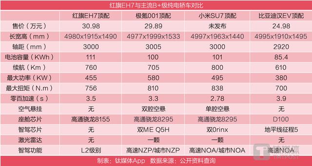 三電方面,紅旗為EH7配備了一塊111度的超大電池,電池容量是同級車型中的最大,這讓EH7的續(xù)航能力位居前列,CLTC續(xù)航達到760公里;EH7四驅(qū)版的動力性能與極氪001和小米SU7不相上下,值得指出的是,紅旗表示EH7的電機最高轉(zhuǎn)速達到22500轉(zhuǎn)/分鐘,是量產(chǎn)車型中的行業(yè)第一,此前小米在SU7的技術(shù)發(fā)布會上也有過類似表述。EH7的零百加速也達到了3秒級,為3.5秒,不及極氪001和小米SU7的3.3秒和2.78秒,但好于比亞迪漢EV的3.9秒。