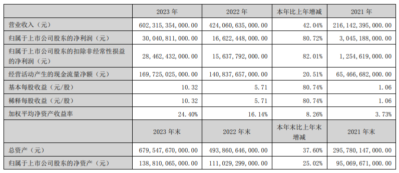 3月26日晚,比亞迪披露2023年年報(bào)。報(bào)告期內(nèi),比亞迪實(shí)現(xiàn)營(yíng)業(yè)收入6023.15億元,同比增長(zhǎng)42.04%;實(shí)現(xiàn)歸母凈利潤(rùn)300.41億元,同比增長(zhǎng)80.72%,經(jīng)營(yíng)性現(xiàn)金流凈額1697.25億元,均創(chuàng)歷史新高。