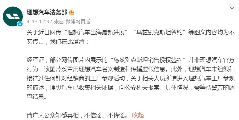 此外,@理想汽車法務(wù)部 日前發(fā)文稱,關(guān)于近日網(wǎng)傳“理想汽車出海最新進展”“烏茲別克斯坦簽約”等圖文內(nèi)容均為不實傳言。