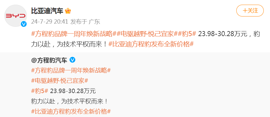 7月29日晚間,比亞迪旗下方程豹宣布品牌一周年煥新戰(zhàn)略,“豹5”車型上線全新價格,售價區(qū)間現為23.98萬元—30.28萬元。