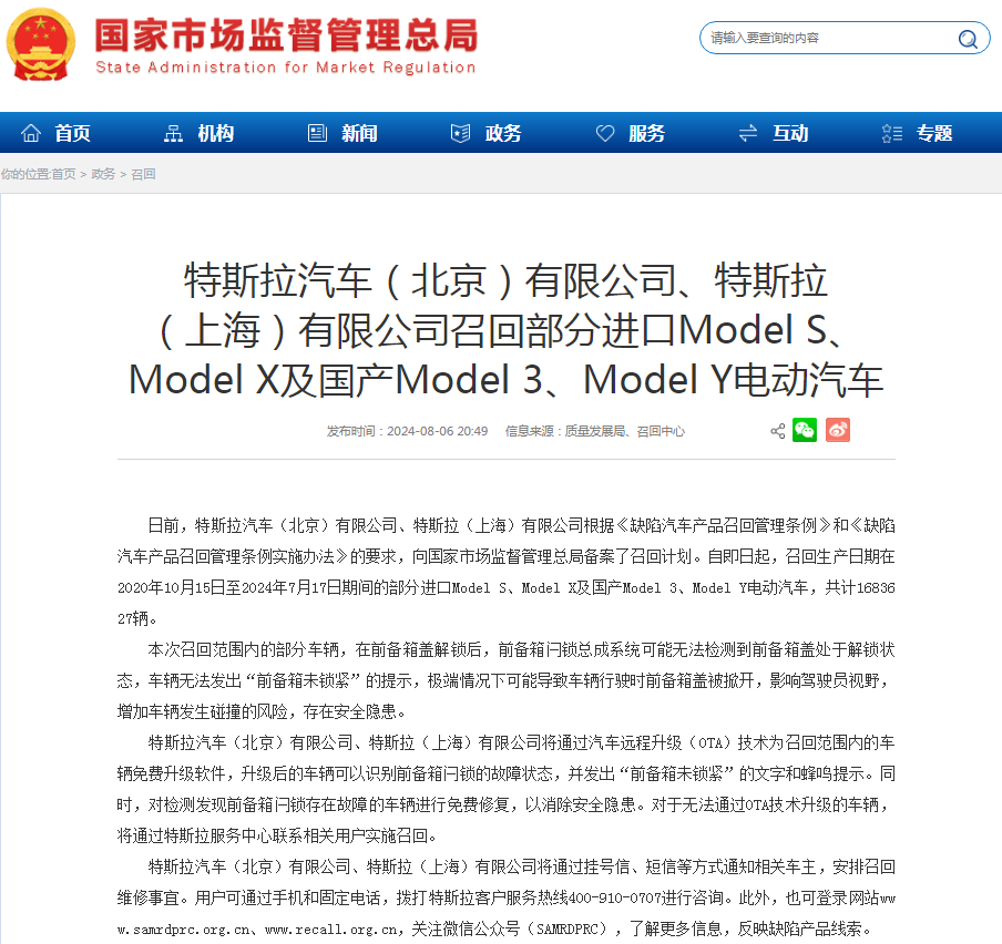 據(jù)市場監(jiān)管總局6日消息,特斯拉汽車(北京)有限公司、特斯拉(上海)有限公司根據(jù)《缺陷汽車產(chǎn)品召回管理?xiàng)l例》和《缺陷汽車產(chǎn)品召回管理?xiàng)l例實(shí)施辦法》的要求,近日向市場監(jiān)管總局備案了召回計(jì)劃:自即日起,召回生產(chǎn)日期在2020年10月15日至2024年7月17日期間的部分進(jìn)口Model S、Model X及國產(chǎn)Model 3、Model Y電動(dòng)汽車,共計(jì)1683627輛。