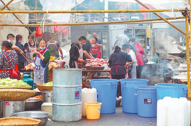我第一次路過(guò)這個(gè)安置點(diǎn),是地震發(fā)生后的第二天,我跟隨電力救援人員來(lái)這里采訪。安置點(diǎn)內(nèi),是一頂頂整齊排列的臨時(shí)帳篷,安置點(diǎn)外的臨時(shí)廚房里,架著數(shù)口大鐵鍋,鍋內(nèi)正煮著牛肚、豬頭肉等食材,看樣子應(yīng)該是用來(lái)涼拌的。一個(gè)中年男人正在切一大扇豬肉,幾個(gè)中年女人在淘洗蔬菜,還有幾個(gè)身穿圍裙的年輕人來(lái)回穿梭。這些忙碌著的人,大都是周邊的受災(zāi)群眾和商販。