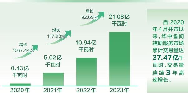 華中省間電力輔助服務(wù)市場交易量(省間調(diào)峰輔助服務(wù)交易量+省間備用輔助服務(wù)交易量)連續(xù)3年高速增長。2020年、2021年、2022年、2023年交易量分別為0.43億、5.02億、10.94億、21.08億千瓦時(shí),2021、2022、2023年交易量分別同比增長1067.44%、117.93%、92.69%。自2020年4月開市以來,市場累計(jì)交易量達(dá)37.47億千瓦時(shí)。