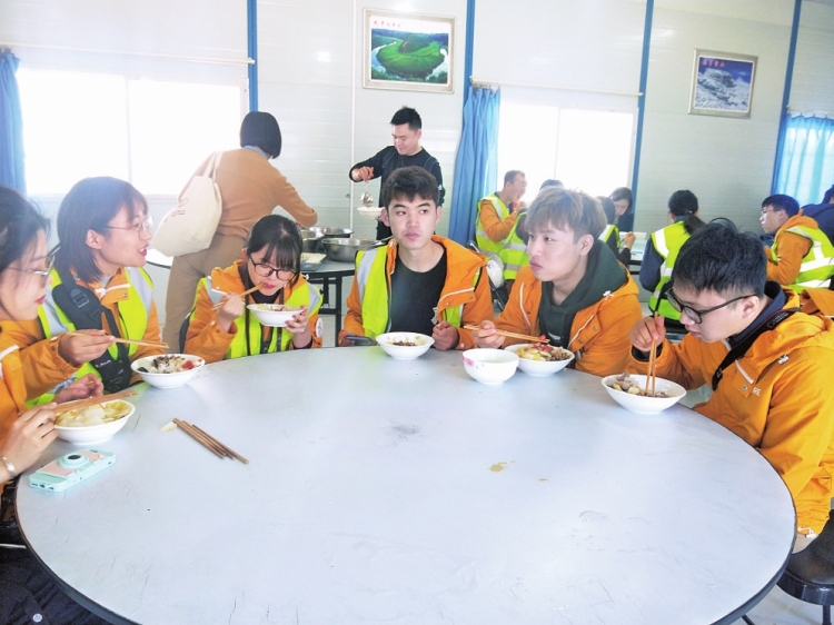 14名大學(xué)生在昆北換流站臨時(shí)食堂和建設(shè)者一起用午餐。南網(wǎng)傳媒全媒體記者 李剛 攝