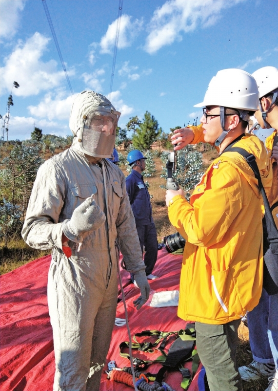 在±800千伏楚穗直流線(xiàn)路2號(hào)塔,當(dāng)超高壓公司昆明局輸電管理所帶電班班長(zhǎng)張曉輝向大家展示他的特高壓帶電作業(yè)屏蔽服時(shí),武漢大學(xué)大四學(xué)生喬曉亮忍不住試穿了一把。穿上屏蔽服,開(kāi)始喬曉亮覺(jué)得新鮮,但沿著高壓線(xiàn)路在地面走了不到十分鐘,額頭上立即冒出汗珠,“當(dāng)架空輸電線(xiàn)路上出現(xiàn)故障時(shí),帶電作業(yè)人員就需要穿著這樣的服裝背著三四十斤的工具,走在70多米的高塔上帶電作業(yè),聽(tīng)起來(lái)不可思議,但這就是南網(wǎng)員工的日常。”喬曉亮說(shuō)。