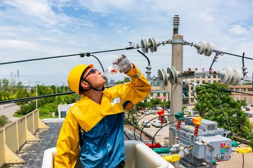 國網山東濟寧供電公司員工在烈日高溫下完成智能開關更換作業(yè)后補充水分。