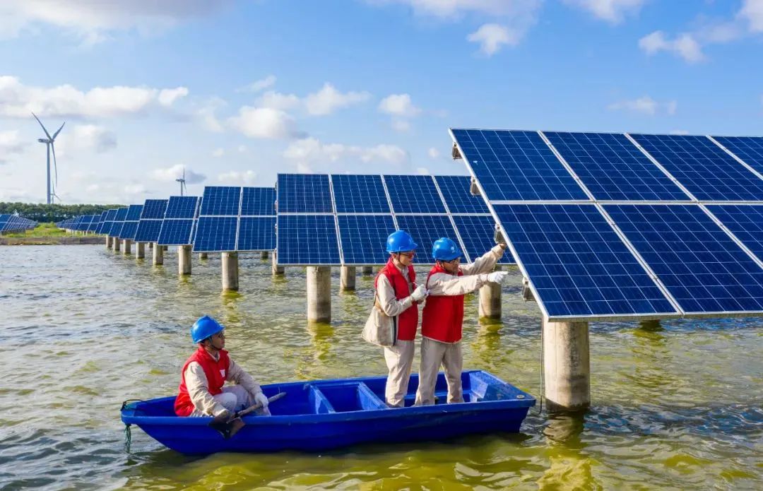 ▲國網(wǎng)江蘇南通供電公司員工在“漁光互補(bǔ)”光伏電站巡檢光伏發(fā)電設(shè)備。
