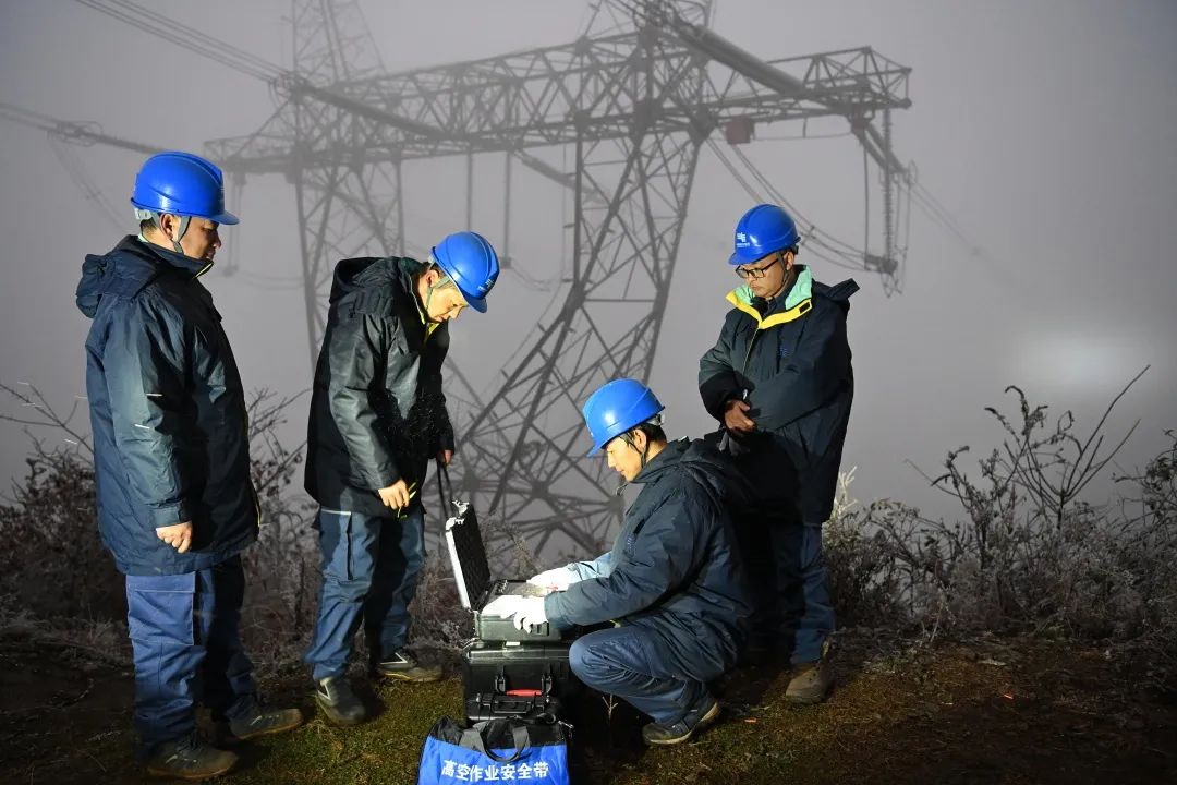 南方電網(wǎng)超高壓公司柳州局黨員突擊隊(duì)在500千伏線路所在地測(cè)量風(fēng)速、濕度,量冰厚、觀冰情。(焦偉軍 攝)