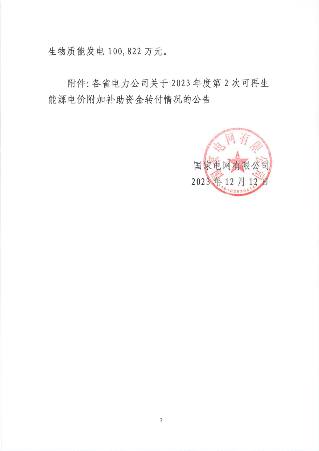 原文如下:按照《財(cái)政部 國家發(fā)展改革委 國家能源局關(guān)于印發(fā)<可再生能源電價(jià)附加資金管理辦法>的通知》(財(cái)建〔2020〕5號)文件要求,國家電網(wǎng)有限公司(以下簡稱“公司”)將2023年第2次可再生能源電價(jià)附加補(bǔ)助資金的撥付原則和順序等相關(guān)情況公告如下:一、補(bǔ)助資金撥付原則和順序公司嚴(yán)格按照財(cái)政部《關(guān)于調(diào)劑2023年可再生能源電價(jià)附加補(bǔ)助資金預(yù)算的通知》(財(cái)資〔2023〕93號)中明確的補(bǔ)貼資金撥付原則和順序,在收到財(cái)政部撥付款項(xiàng)后,對納入補(bǔ)貼目錄或清單且滿足結(jié)算條件的各類項(xiàng)目進(jìn)行及時(shí)、足額轉(zhuǎn)付。具體情況見各省電力公司公告。二、2023年第2次補(bǔ)助資金情況2023年11月,財(cái)政部下達(dá)公司可再生能源電價(jià)附加補(bǔ)助資金年度預(yù)算2,550,000萬元,其中:風(fēng)力發(fā)電1,224,013萬元,太陽能發(fā)電1,225,165萬元,生物質(zhì)能發(fā)電100,822萬元。