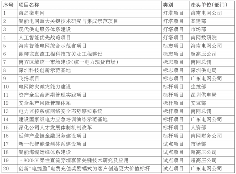 日前,南方電網(wǎng)公司對(duì)實(shí)施成果顯著、貢獻(xiàn)突出的20個(gè)“四類項(xiàng)目”優(yōu)秀團(tuán)隊(duì)予以通報(bào)嘉獎(jiǎng),其中燈塔項(xiàng)目4個(gè)、標(biāo)志項(xiàng)目5個(gè)、標(biāo)桿項(xiàng)目7個(gè)、試點(diǎn)項(xiàng)目4個(gè)。