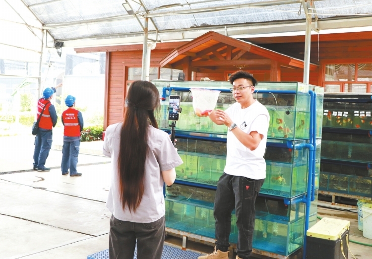 廣東省佛山市南海區(qū)里水鎮(zhèn)擁有全國最大的觀賞魚養(yǎng)殖產(chǎn)銷基地,近200家錦鯉養(yǎng)殖企業(yè)在此落戶,八成從事電商銷售。“這是我們今年賣得最好的紅白品種,體形流暢粗壯,墨質(zhì)醇厚有光澤。”廣東惠和錦錦鯉養(yǎng)殖公司主播黃小姐正在直播間介紹著“6·18”促銷活動。