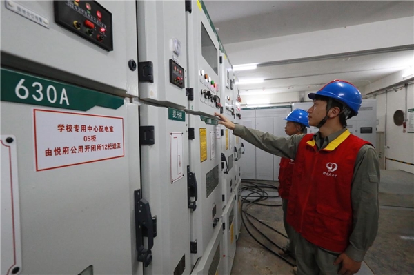 與此同時(shí),在黃陂區(qū)第一中學(xué),服務(wù)隊(duì)員仔細(xì)查看了校園內(nèi)的用電設(shè)備使用情況。由于暑假期間學(xué)校的電氣設(shè)備大多處于閑置無負(fù)荷狀態(tài),加之夏季高溫、暴雨等多種因素影響,開學(xué)后校園用電負(fù)荷將大幅增長(zhǎng),容易導(dǎo)致用電設(shè)備出現(xiàn)短路、漏電等安全隱患。服務(wù)隊(duì)員根據(jù)學(xué)校的實(shí)際情況,逐一檢查校內(nèi)配電室的高低壓柜、變壓器、備用電源以及教學(xué)樓、食堂等處的用電線路及用電設(shè)備,對(duì)學(xué)校內(nèi)部線路絕緣老化、進(jìn)出線連接不規(guī)范、開關(guān)接觸不良等問題及時(shí)處理,積極配合校方進(jìn)行整改,確保學(xué)校用電設(shè)備在開學(xué)之前全部正常運(yùn)轉(zhuǎn)。“根據(jù)咱們學(xué)校的用電負(fù)荷特點(diǎn),我們優(yōu)化了供電線路的布局,也合理調(diào)整了變壓器的運(yùn)行檔位,制定了詳細(xì)的專項(xiàng)保供電方案,并與學(xué)校建立聯(lián)動(dòng)機(jī)制,確保開學(xué)時(shí)的正常供電。”服務(wù)隊(duì)員一邊進(jìn)行安全用電檢查,一邊對(duì)學(xué)校后勤相關(guān)負(fù)責(zé)人說道。