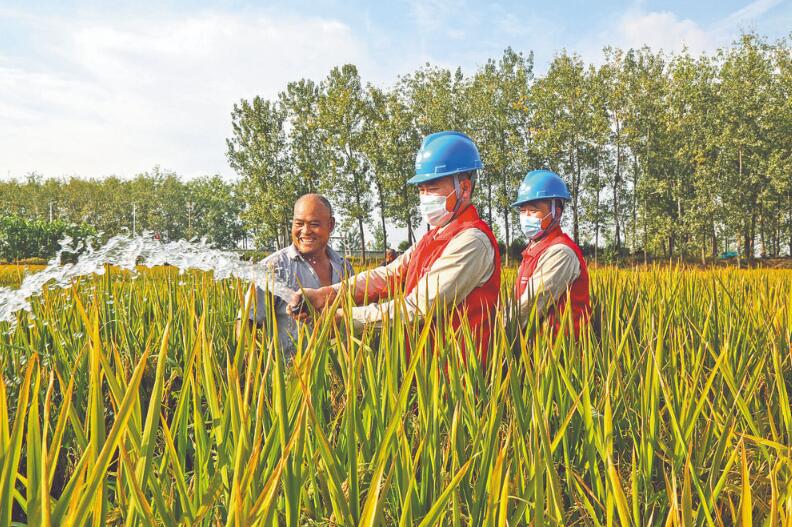 10月8日,國家電網(wǎng)江蘇電力(鹽電鐵軍·金海星)共產(chǎn)黨員服務(wù)隊隊員來到東臺市梁垛鎮(zhèn)孔堡村,檢查供電線路和抽水用電控制設(shè)備,排查用電安全隱患,保障晚秋水稻孕穗灌漿期安全可靠用電。秋收時節(jié),黨員服務(wù)隊隊員深入田間地頭,檢查種植戶稻田抽水供電線路和用電控制設(shè)備,為晚秋水稻增產(chǎn)豐收添保障。
