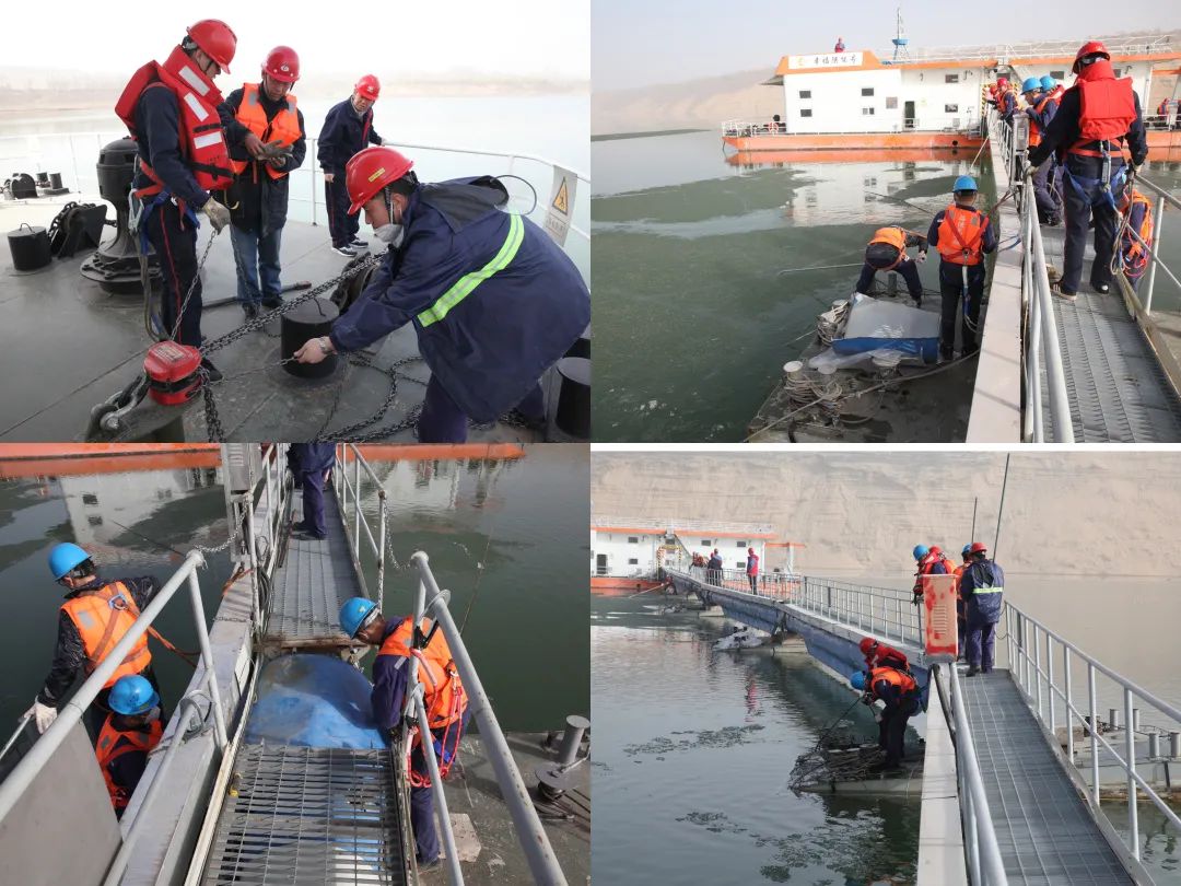 為縮短搶修時(shí)間,大家明確分工,多點(diǎn)開花,除冰、接頭檢查、浮橋踏步修正、護(hù)欄軟連接鏈條修正、泵船錨鏈調(diào)整等各項(xiàng)工作同步開展。大風(fēng)無(wú)情人有情,搶修組選擇就地用餐,后勤組按時(shí)按點(diǎn)送來(lái)營(yíng)養(yǎng)豐富的加班餐,大家吃在嘴里,暖在心里。生產(chǎn)副總經(jīng)理組織各項(xiàng)具體搶修工作,制定搶修工作方案,協(xié)調(diào)管線試用,全力確保用水安全可靠。
