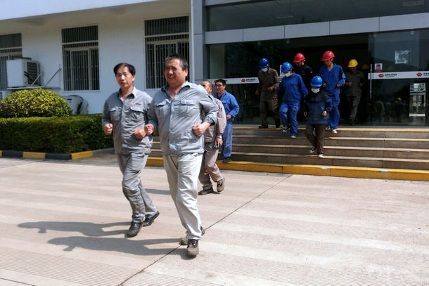 11時(shí)20分,演練活動(dòng)正式開(kāi)始。隨著地震模擬信號(hào)(哨音)發(fā)出,辦公樓、輸煤綜合樓內(nèi)的員工立即就地躲避在三角區(qū)或內(nèi)墻角等牢固地點(diǎn),用雙手保護(hù)頭部,等地震減弱后,快速、安全、有序地撤離到指定區(qū)域。